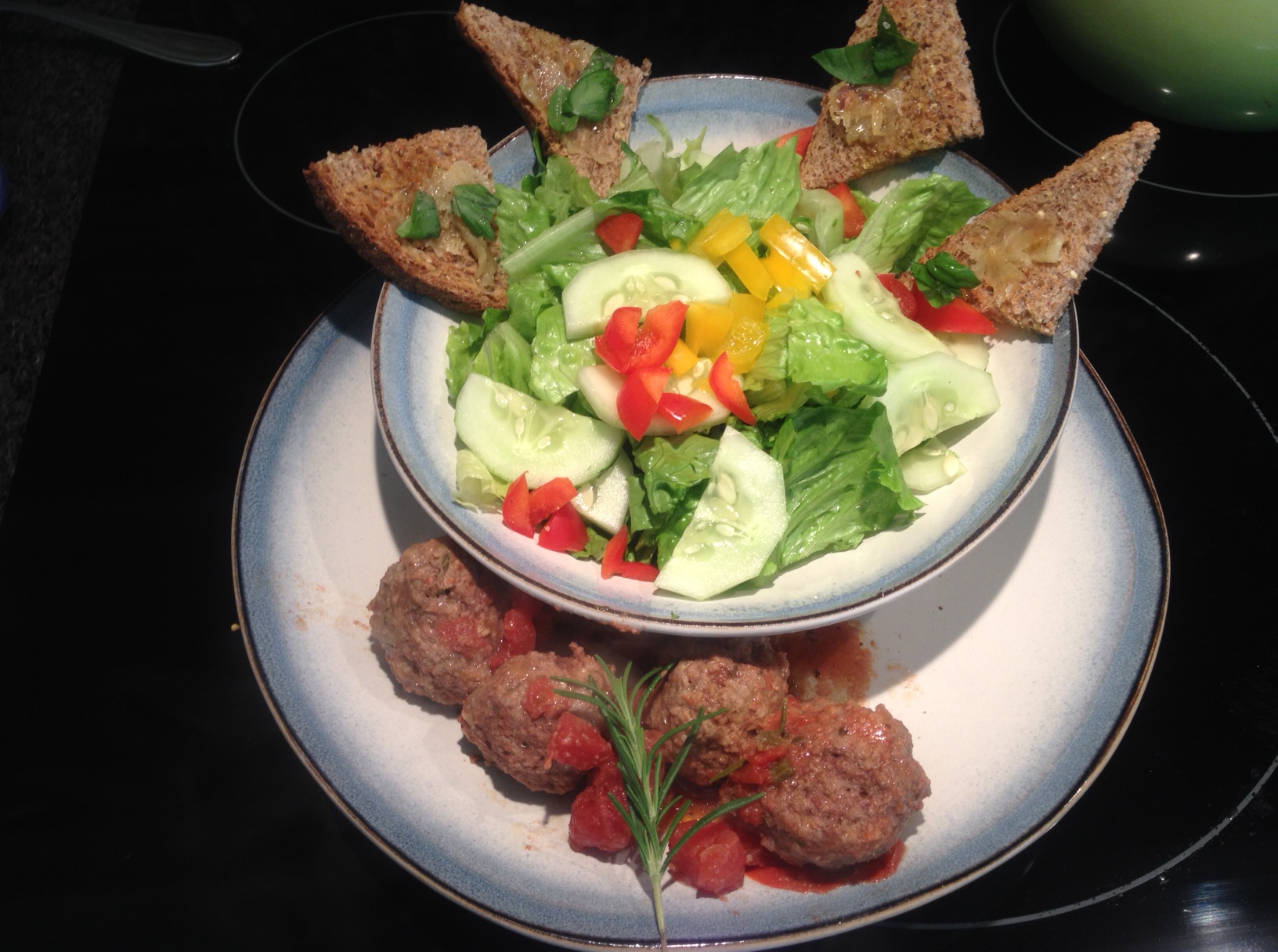 Rosemary Bison Meatballs with Ezekiel Garlic Toast and Salad